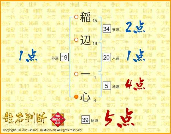 稲辺一心さんの総運は39画の5点!