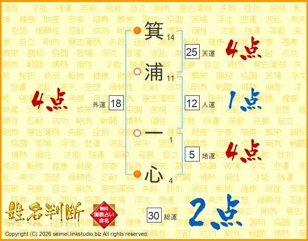 生活面を象徴する運勢です。外部から受ける影響力を表し、結婚運、家庭運や職場、環境への順応性を表します。総運から人運を引いた画数。姓や名が1文字の場合を除く。