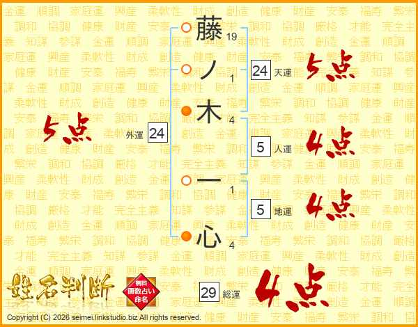 藤(19画)ノ(1画)木(4画) 一(1画)心(4画)