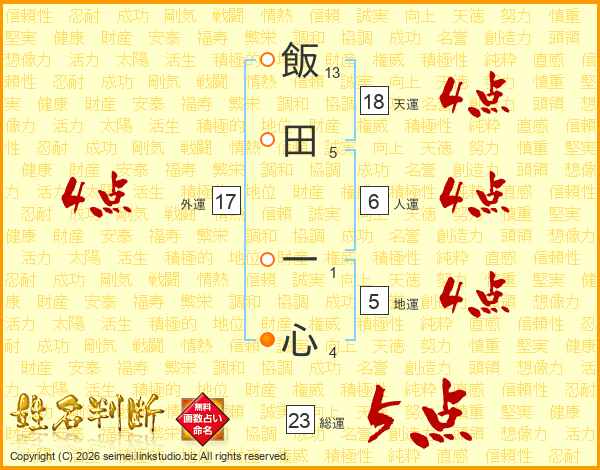 生活面を象徴する運勢です。外部から受ける影響力を表し、結婚運、家庭運や職場、環境への順応性を表します。総運から人運を引いた画数。姓や名が1文字の場合を除く。