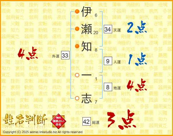 伊瀬知一志さんの天運は34画の2点!