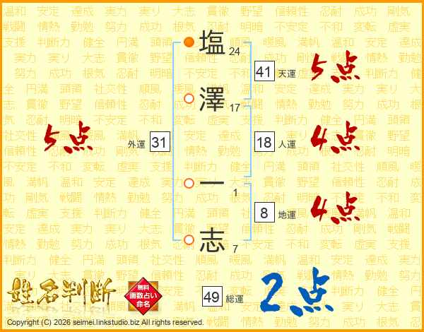生活面を象徴する運勢です。外部から受ける影響力を表し、結婚運、家庭運や職場、環境への順応性を表します。総運から人運を引いた画数。姓や名が1文字の場合を除く。