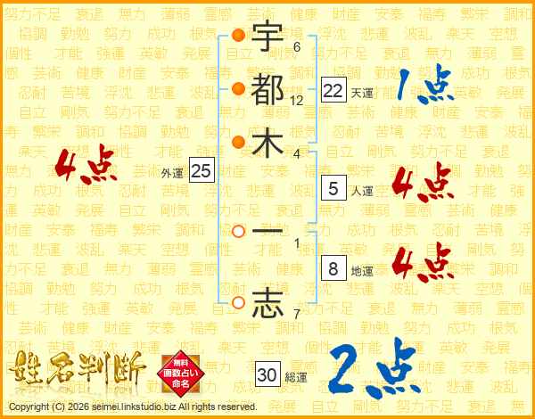 宇(6画)都(12画)木(4画) 一(1画)志(7画)