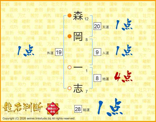 生活面を象徴する運勢です。外部から受ける影響力を表し、結婚運、家庭運や職場、環境への順応性を表します。総運から人運を引いた画数。姓や名が1文字の場合を除く。