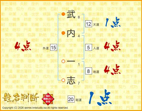 武(8画)内(4画) 一(1画)志(7画)