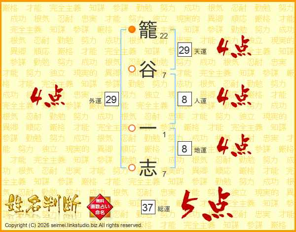 あなたの人生を表す1番重要な運勢です。生涯を通じて影響する総合運となり、主に50歳以降の晩年期に影響を及ぼします。苗字と名前の合計画数。