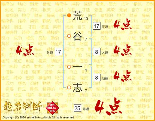 生活面を象徴する運勢です。外部から受ける影響力を表し、結婚運、家庭運や職場、環境への順応性を表します。総運から人運を引いた画数。姓や名が1文字の場合を除く。