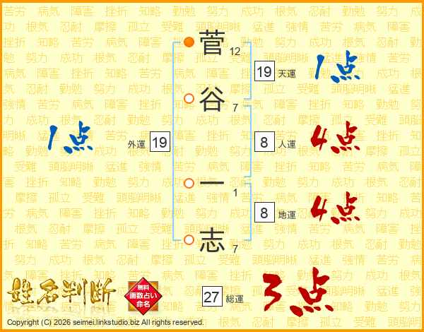 あなたの人生を表す1番重要な運勢です。生涯を通じて影響する総合運となり、主に50歳以降の晩年期に影響を及ぼします。苗字と名前の合計画数。