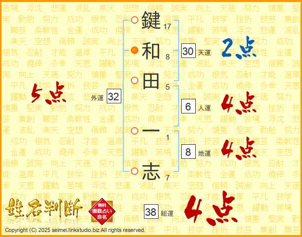 鍵(17画)和(8画)田(5画) 一(1画)志(7画)