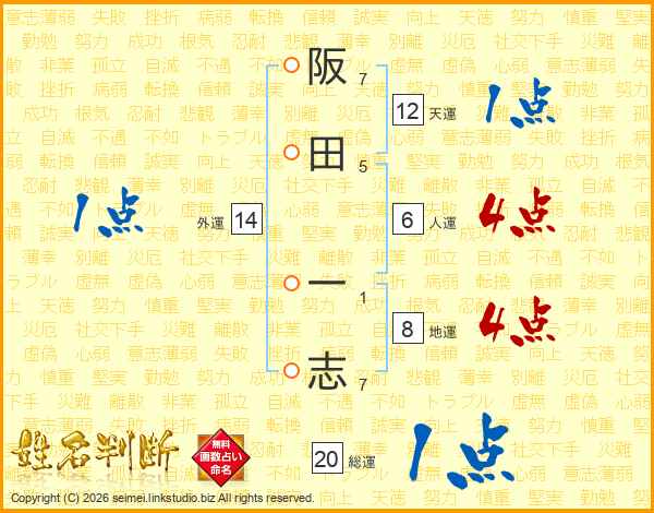 阪田一志さんの総運は20画の1点!