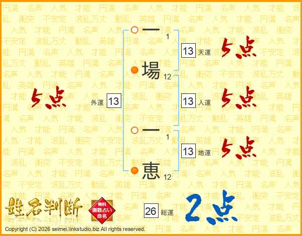 生活面を象徴する運勢です。外部から受ける影響力を表し、結婚運、家庭運や職場、環境への順応性を表します。総運から人運を引いた画数。姓や名が1文字の場合を除く。