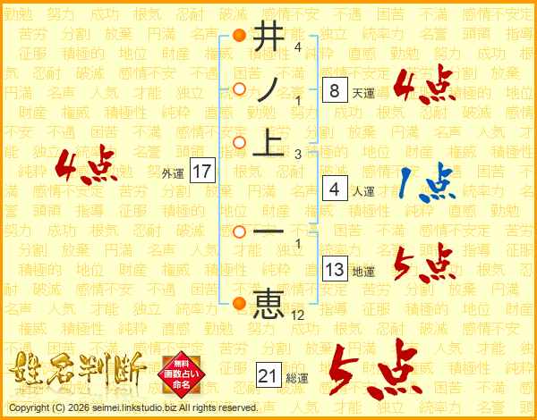 井(4画)ノ(1画)上(3画) 一(1画)恵(12画)