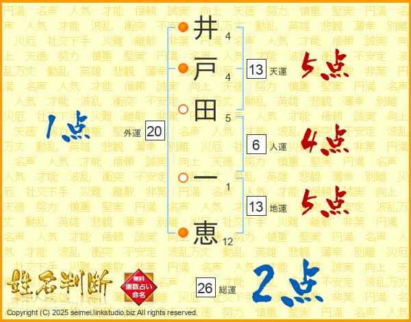 井(4画)戸(4画)田(5画) 一(1画)恵(12画)