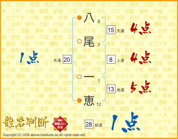 生活面を象徴する運勢です。外部から受ける影響力を表し、結婚運、家庭運や職場、環境への順応性を表します。総運から人運を引いた画数。姓や名が1文字の場合を除く。