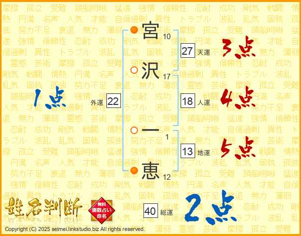 宮(10画)沢(17画) 一(1画)恵(12画)