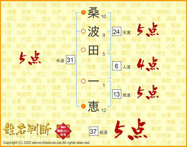 桑(10画)波(9画)田(5画) 一(1画)恵(12画)