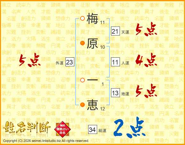 梅(11画)原(10画) 一(1画)恵(12画)