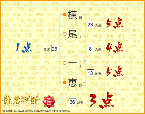 生活面を象徴する運勢です。外部から受ける影響力を表し、結婚運、家庭運や職場、環境への順応性を表します。総運から人運を引いた画数。姓や名が1文字の場合を除く。