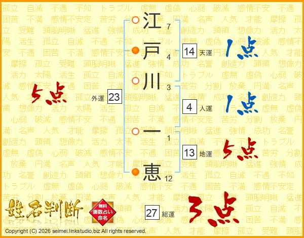 江(7画)戸(4画)川(3画) 一(1画)恵(12画)