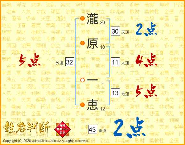 瀧(20画)原(10画) 一(1画)恵(12画)