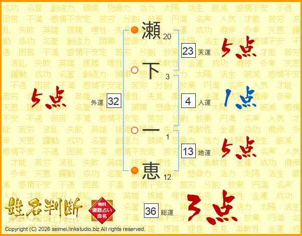 瀬(20画)下(3画) 一(1画)恵(12画)