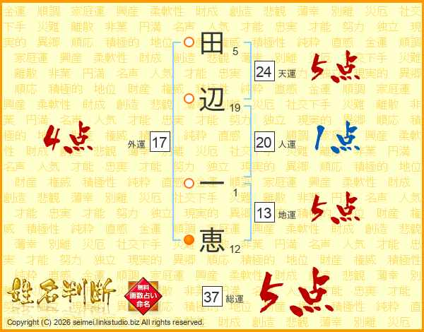 生活面を象徴する運勢です。外部から受ける影響力を表し、結婚運、家庭運や職場、環境への順応性を表します。総運から人運を引いた画数。姓や名が1文字の場合を除く。