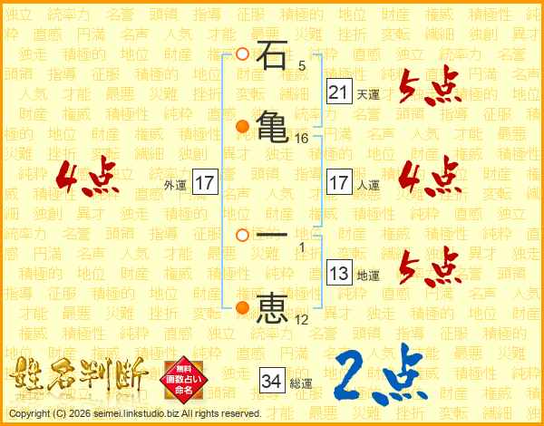 あなたの人生を表す1番重要な運勢です。生涯を通じて影響する総合運となり、主に50歳以降の晩年期に影響を及ぼします。苗字と名前の合計画数。
