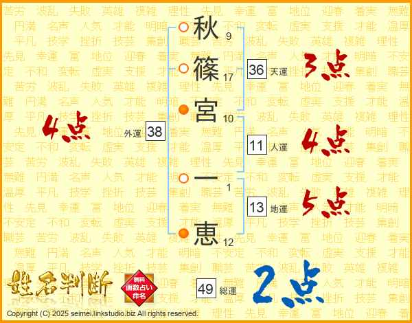 秋(9画)篠(17画)宮(10画) 一(1画)恵(12画)