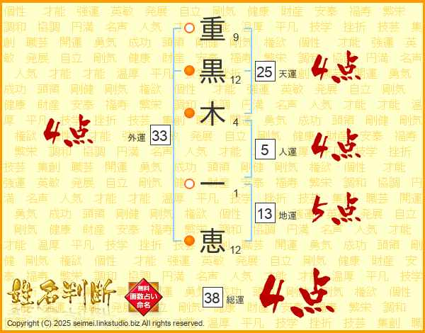 重(9画)黒(12画)木(4画) 一(1画)恵(12画)
