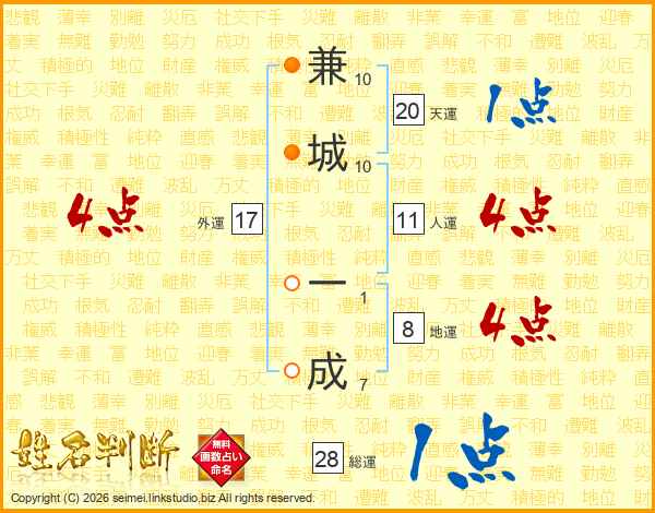 生活面を象徴する運勢です。外部から受ける影響力を表し、結婚運、家庭運や職場、環境への順応性を表します。総運から人運を引いた画数。姓や名が1文字の場合を除く。