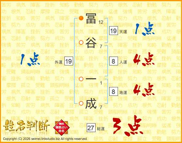 生活面を象徴する運勢です。外部から受ける影響力を表し、結婚運、家庭運や職場、環境への順応性を表します。総運から人運を引いた画数。姓や名が1文字の場合を除く。