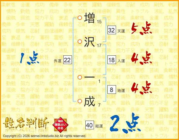 生活面を象徴する運勢です。外部から受ける影響力を表し、結婚運、家庭運や職場、環境への順応性を表します。総運から人運を引いた画数。姓や名が1文字の場合を除く。