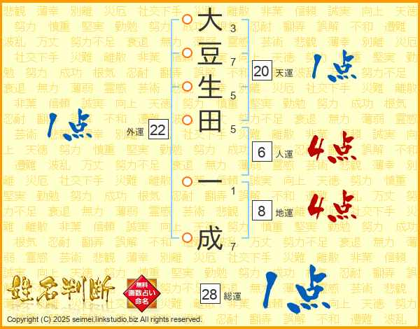 大(3画)豆(7画)生(5画)田(5画) 一(1画)成(7画)