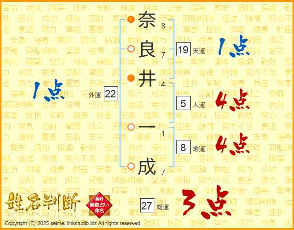 奈(8画)良(7画)井(4画) 一(1画)成(7画)