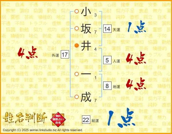 小(3画)坂(7画)井(4画) 一(1画)成(7画)