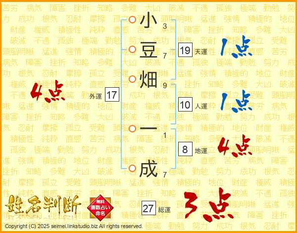 小(3画)豆(7画)畑(9画) 一(1画)成(7画)