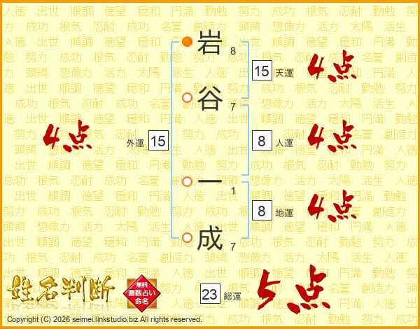 生活面を象徴する運勢です。外部から受ける影響力を表し、結婚運、家庭運や職場、環境への順応性を表します。総運から人運を引いた画数。姓や名が1文字の場合を除く。