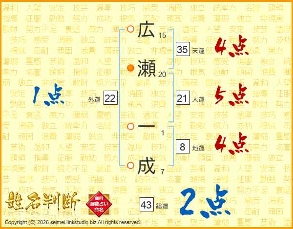 生活面を象徴する運勢です。外部から受ける影響力を表し、結婚運、家庭運や職場、環境への順応性を表します。総運から人運を引いた画数。姓や名が1文字の場合を除く。
