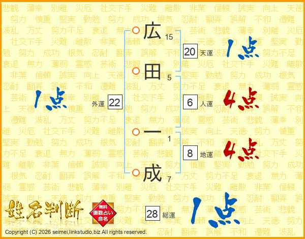 生活面を象徴する運勢です。外部から受ける影響力を表し、結婚運、家庭運や職場、環境への順応性を表します。総運から人運を引いた画数。姓や名が1文字の場合を除く。