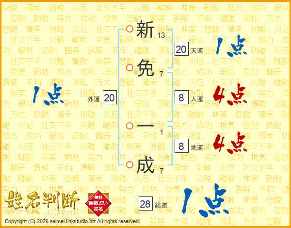 生活面を象徴する運勢です。外部から受ける影響力を表し、結婚運、家庭運や職場、環境への順応性を表します。総運から人運を引いた画数。姓や名が1文字の場合を除く。