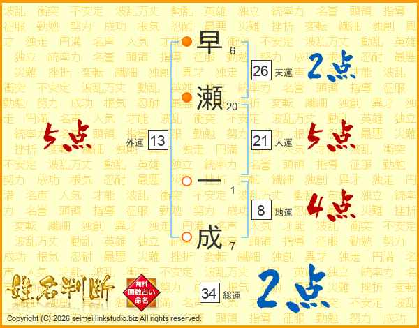 早瀬一成さんの総運は34画の2点!