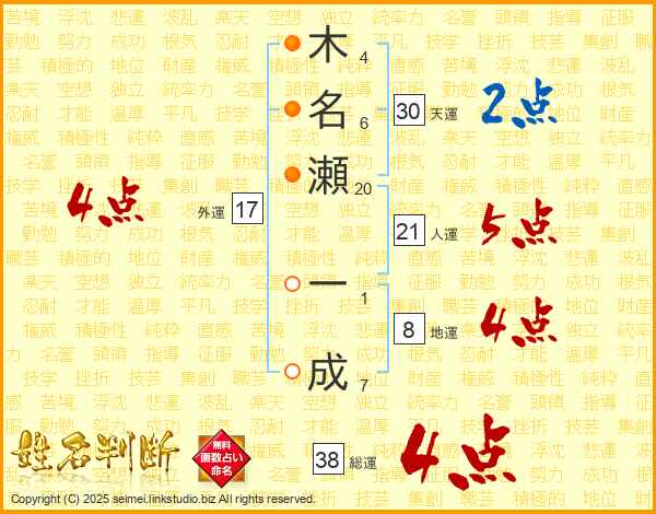 木(4画)名(6画)瀬(20画) 一(1画)成(7画)