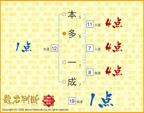 生活面を象徴する運勢です。外部から受ける影響力を表し、結婚運、家庭運や職場、環境への順応性を表します。総運から人運を引いた画数。姓や名が1文字の場合を除く。