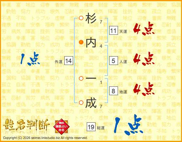 生活面を象徴する運勢です。外部から受ける影響力を表し、結婚運、家庭運や職場、環境への順応性を表します。総運から人運を引いた画数。姓や名が1文字の場合を除く。
