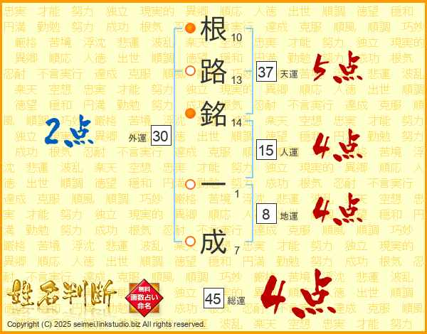 根(10画)路(13画)銘(14画) 一(1画)成(7画)