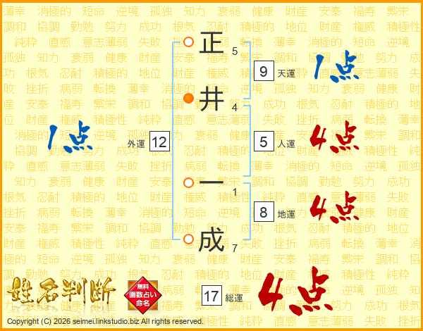生活面を象徴する運勢です。外部から受ける影響力を表し、結婚運、家庭運や職場、環境への順応性を表します。総運から人運を引いた画数。姓や名が1文字の場合を除く。