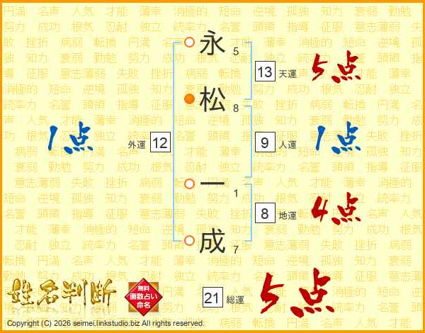 生活面を象徴する運勢です。外部から受ける影響力を表し、結婚運、家庭運や職場、環境への順応性を表します。総運から人運を引いた画数。姓や名が1文字の場合を除く。