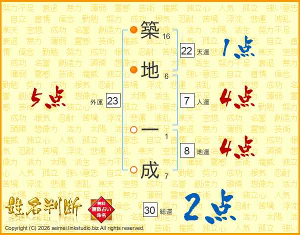 生活面を象徴する運勢です。外部から受ける影響力を表し、結婚運、家庭運や職場、環境への順応性を表します。総運から人運を引いた画数。姓や名が1文字の場合を除く。