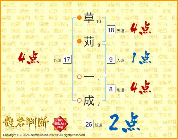 草苅一成さんの総運は26画の2点!