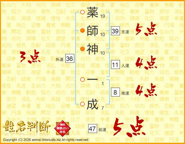 薬(19画)師(10画)神(10画) 一(1画)成(7画)